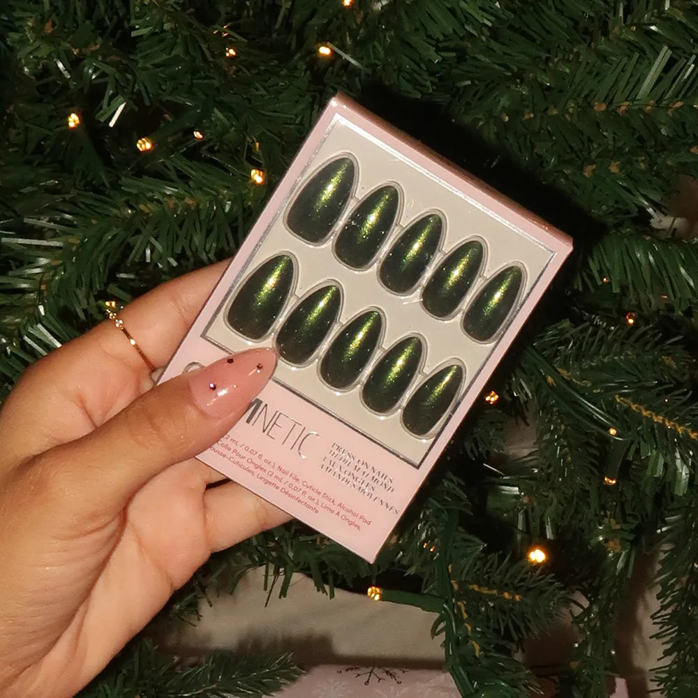 Sleigh season in style with the Cutie Pine Nail Set. Featuring a luminous pearl chrome finish on an emerald-toned base, this medium almond style is designed to catch the light effortlessly at all your upcoming holiday parties.
