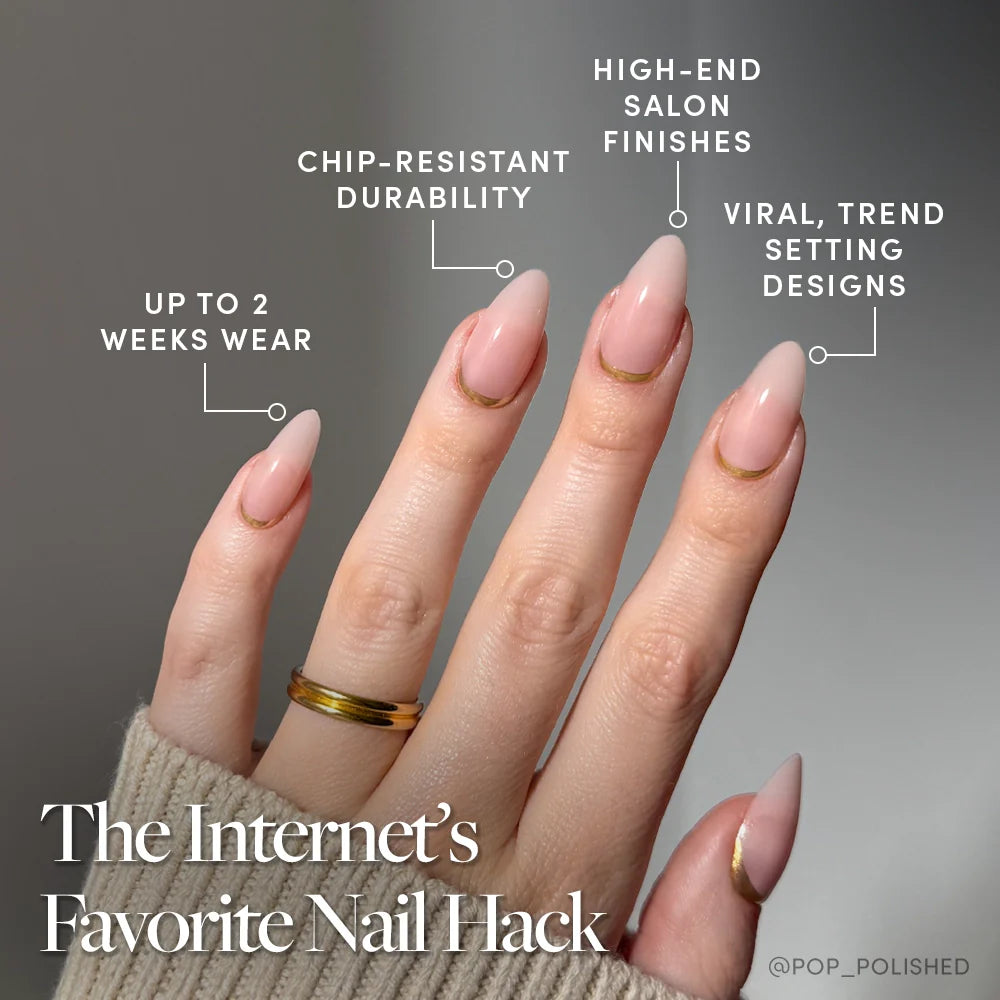 A soft-glam take on ambition. Goal Getter features a semi-transparent nude base with gold foil reversed French tip for a subtle flash of luxe. Set in our new, redesigned medium almond shape, this style elongates the fingers while giving major quiet luxury energy. A high-gloss finish seals the deal. It’s your go-to nail for closing deals, date nights, or just showing up chic.