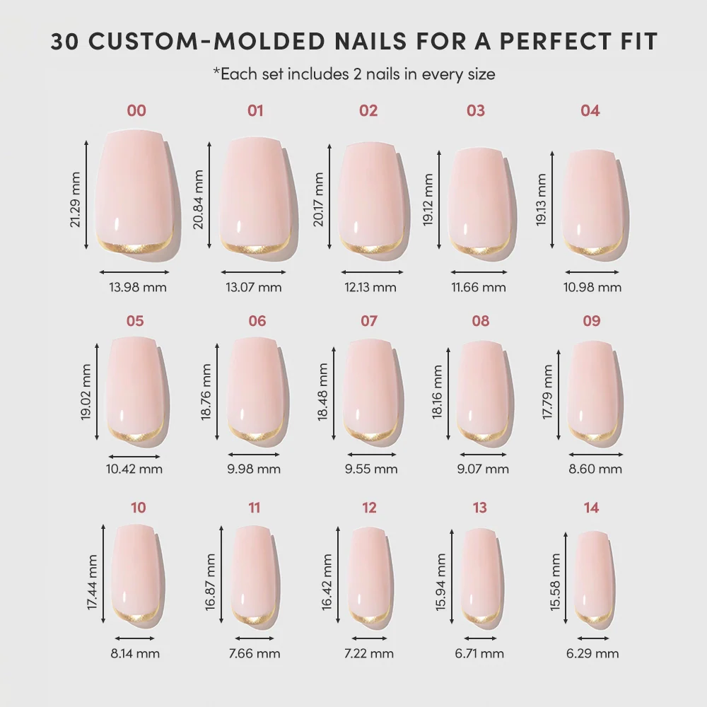 These nails will always be a power move. Inspired by our best-selling Goal Digger mani, the Gold Goals Press-On Nails feature a semi-transparent nude base with a gold foil reversed French tip, finished with a high-shine gloss for a sleek yet subtle statement. Crafted in our bold medium coffin, these salon-quality manis will make your nails look effortlessly rich in just 10 minutes.