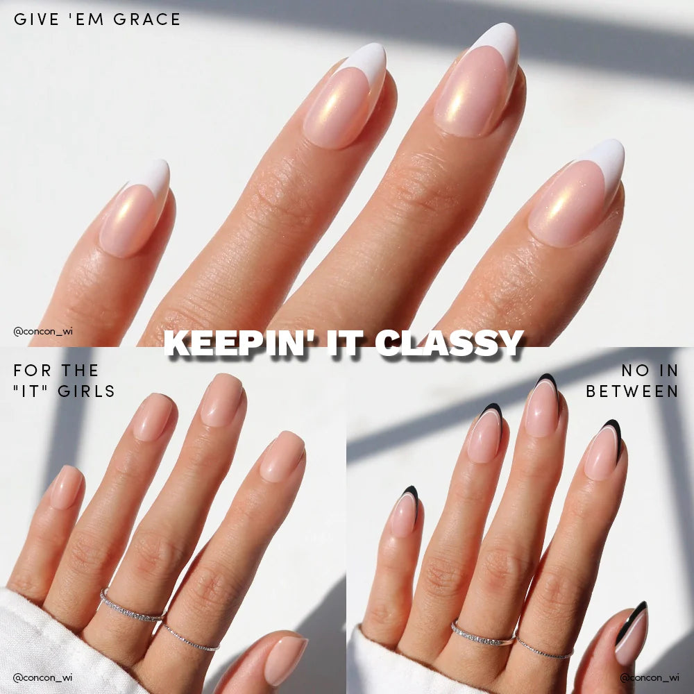 This is for the girls who mean BUSINESS. The KEEPIN’ IT CLASSY bundle serves three effortlessly chic press-on nails for those who celebrate the clean-girl look. With short almond and short squoval shapes, each of these nails is sleek with high-shine gloss and minimalist designs for that just-left-the-salon, always put-together look.