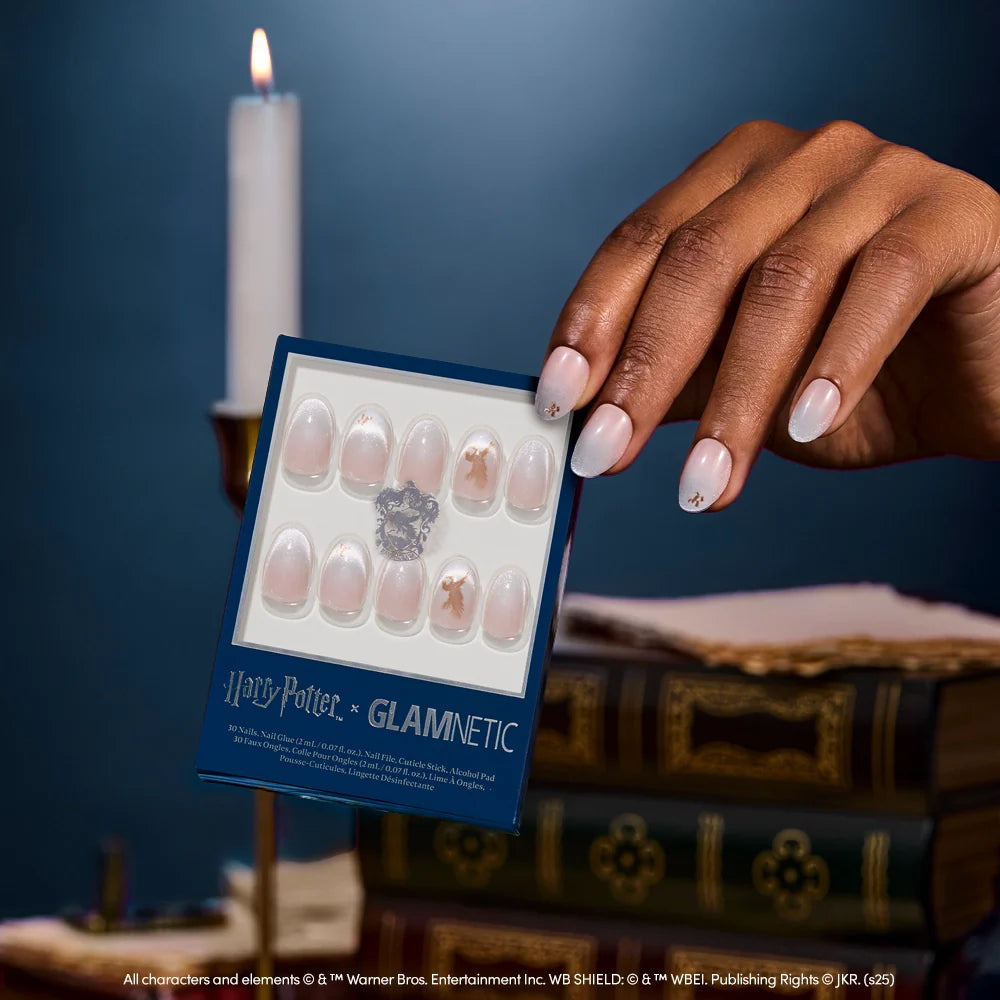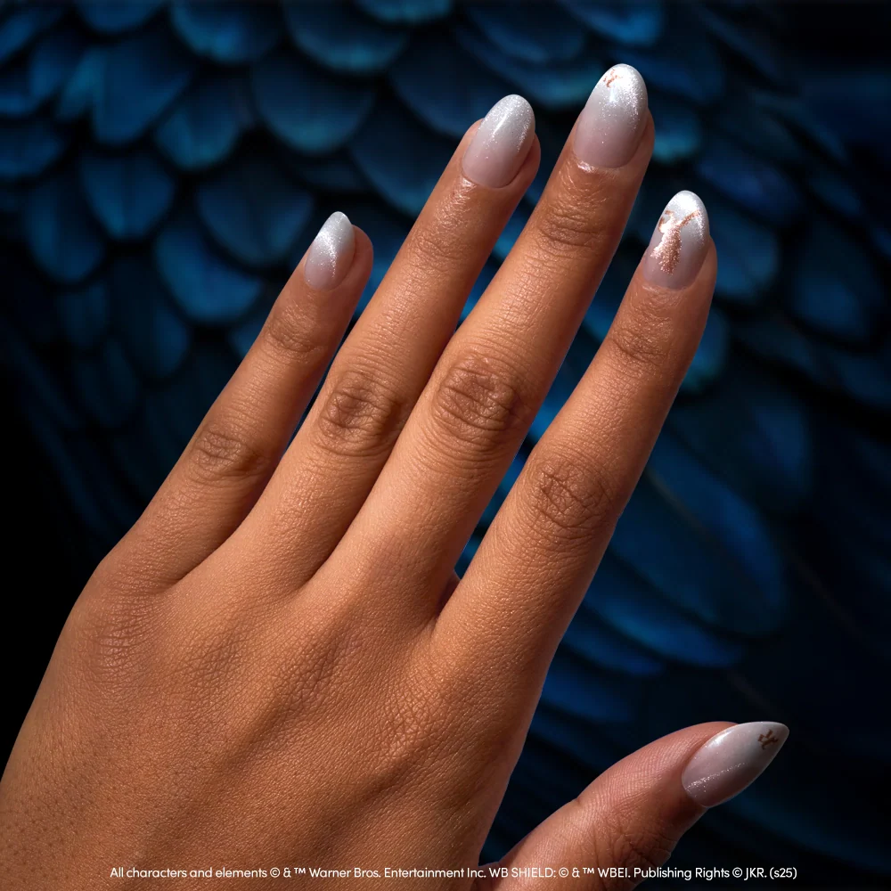 Wisdom never looked so striking. The Rowena Ravenclaw™ Nail Set pairs a nude-to-grey velvet fade with subtle house motifs, echoing the wit, elegance, and sharp intellect of its namesake founder. Finished in a velvet short oval shape, it’s clever, refined, and as timeless as Ravenclaw’s legacy.