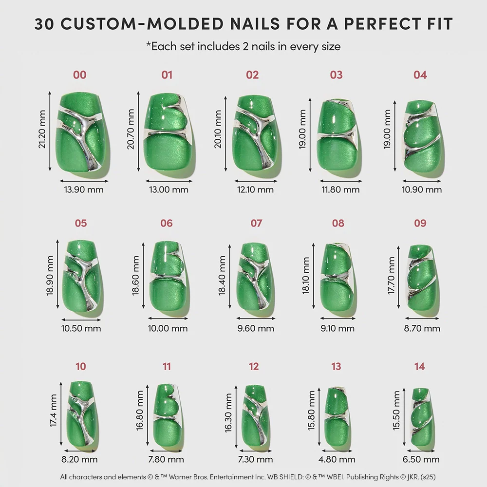 Channel ambition with unapologetic style. The Salazar Slytherin™ Nail Set commands attention with a deep green velvet base, while molten silver 3D accents slither across each nail like a serpent in motion. In a sleek medium coffin shape, it’s cunning, polished, and dangerously sophisticated—just the way Slytherin intended.