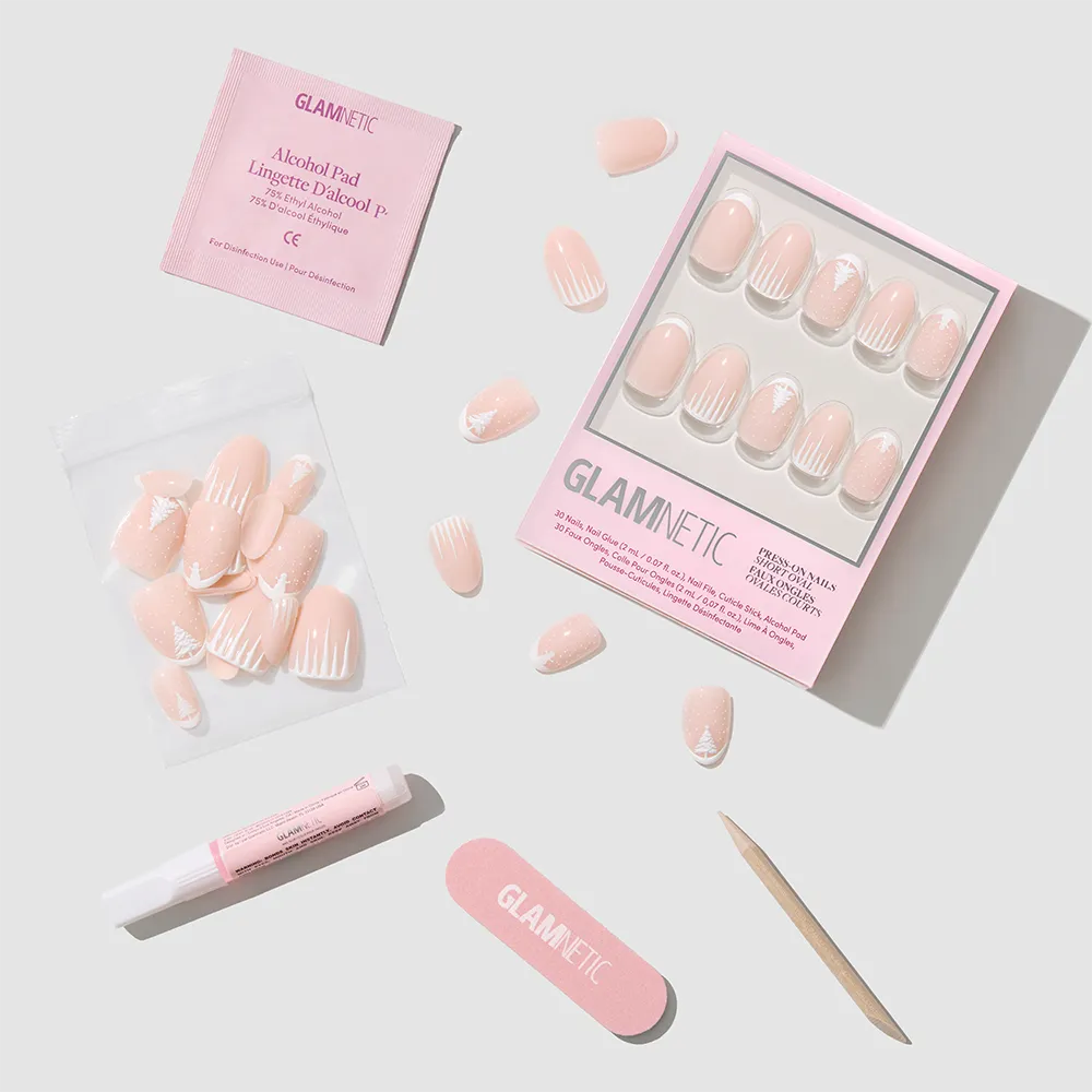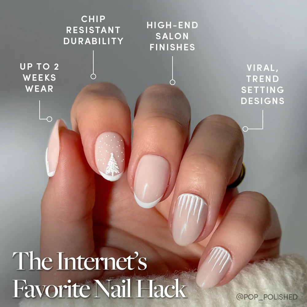 Every nail tells a story with Winter’s Tale. This short oval set pairs a glossy nude base with classic white French tips and raised matte detailing of snow and Christmas trees. The mix of shine and texture creates a frosted finish that feels polished, festive, and full of wintry charm.